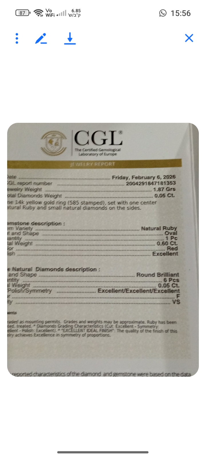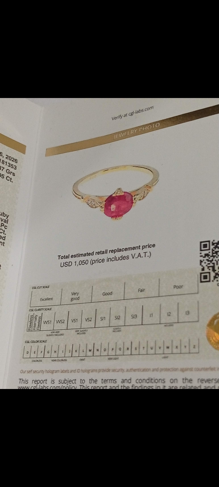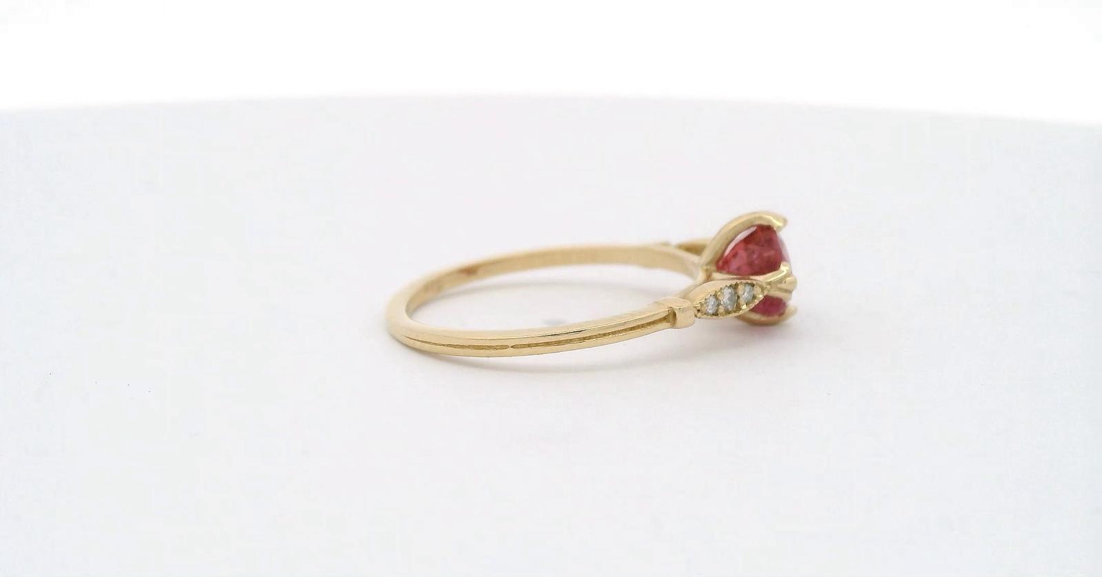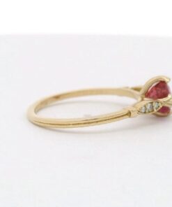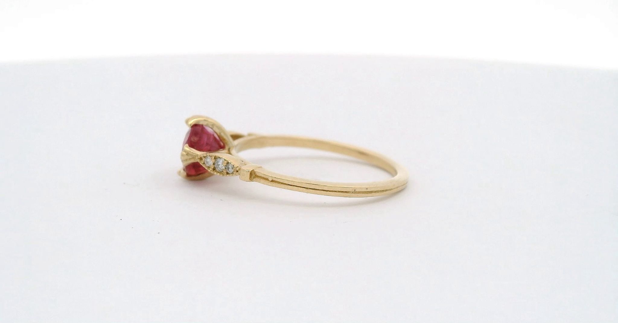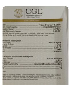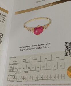 “Solid gold 14crt with natural diamonds and central natural ruby colour pingion blood unique and elegant in style . Central natural ruby and a little natural diamonds looks shiny and not aggressive for eyes certificate Ggl gemologist laboratory for this ring valued for incurring porpoise 1050,,, dollar”