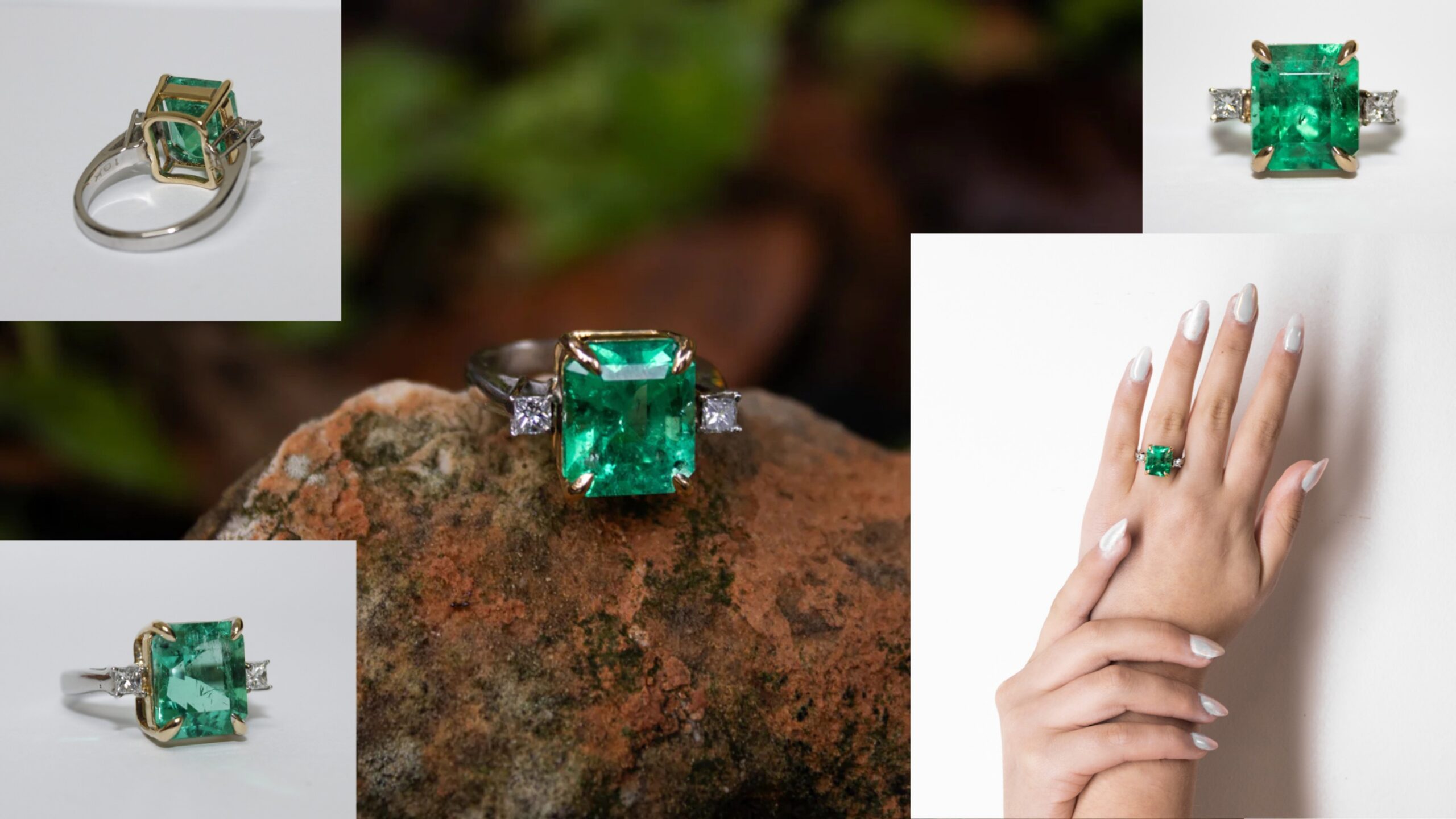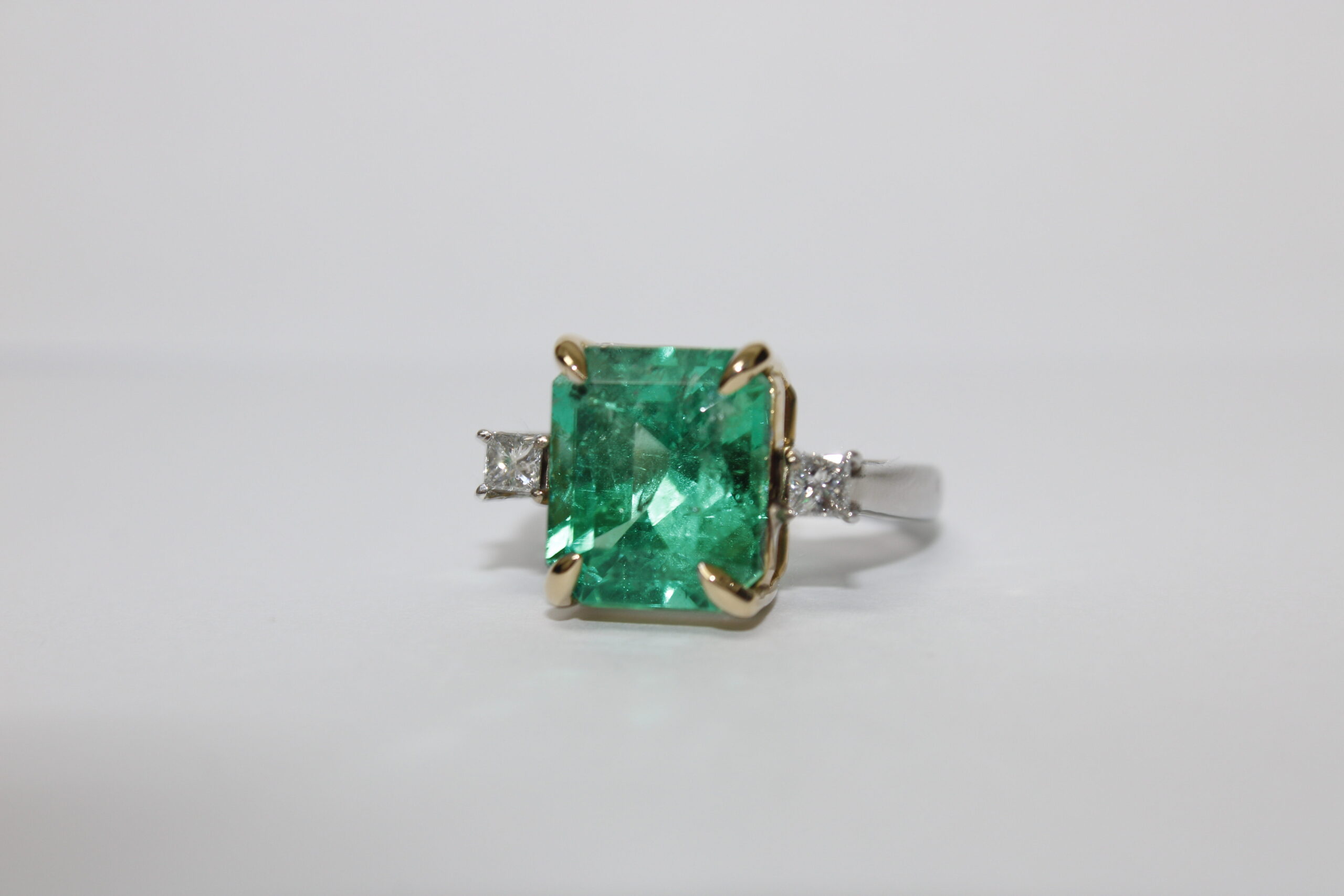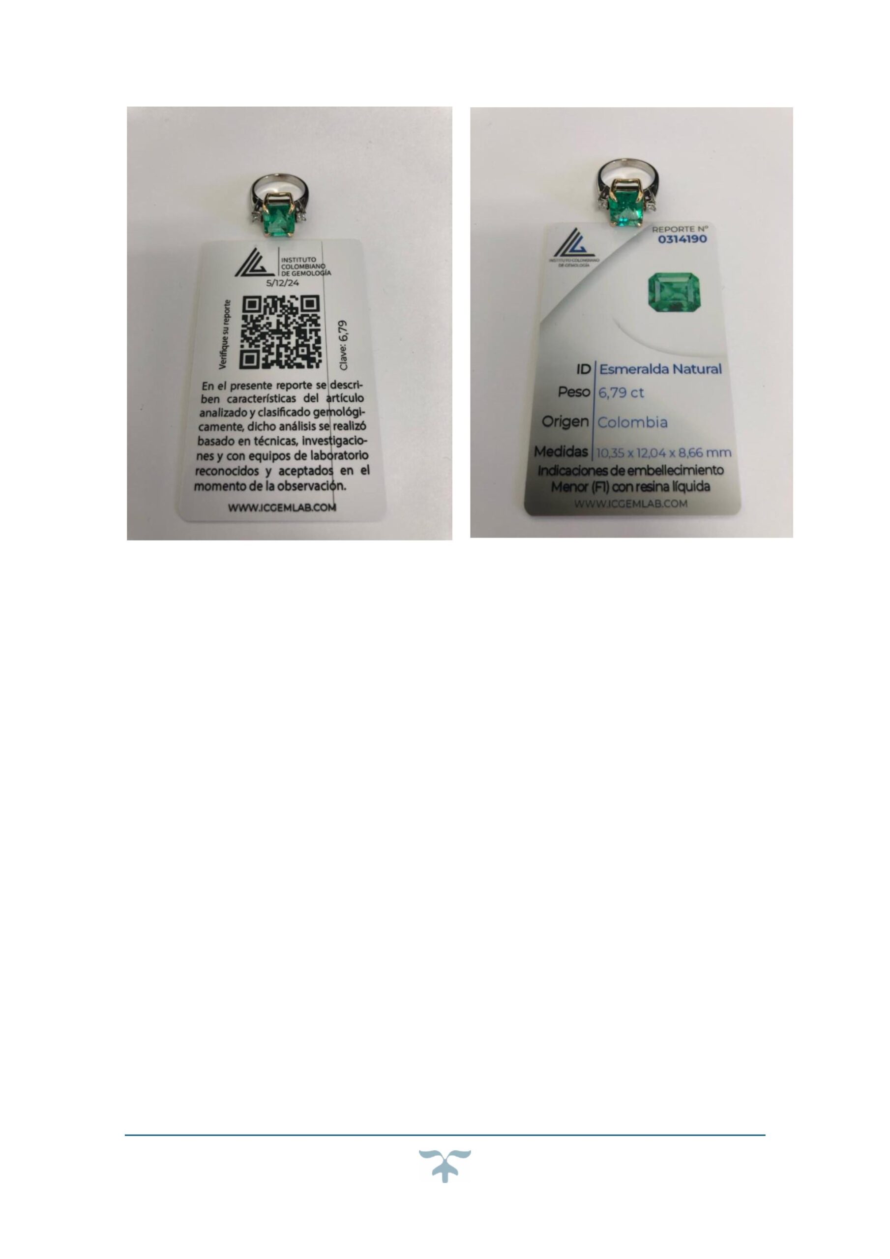 “This exclusive ring combines elegance and sophistication in a timeless design. Crafted in 18K white gold, with the crown holding the gemstones made of 18K yellow gold, the contrast enhances the beauty of the piece. The central feature is an impressive 6.79 ct natural emerald, of Colombian origin, treated with F1 oil to enhance its vibrant color and exceptional clarity, reflecting the richness of its origin.