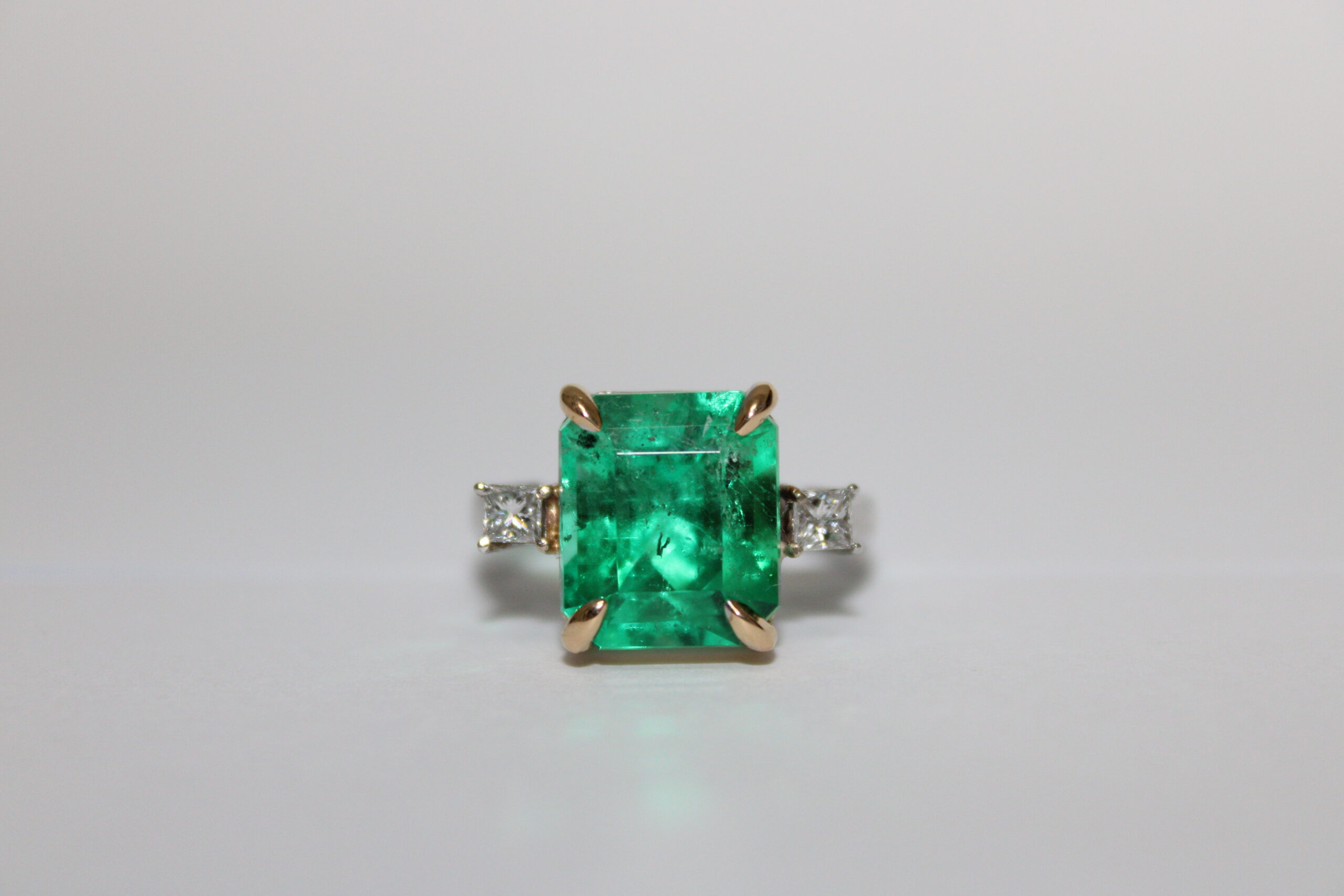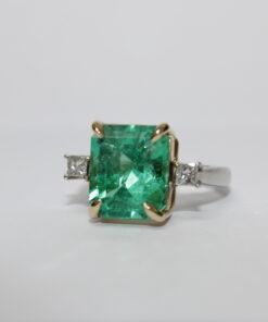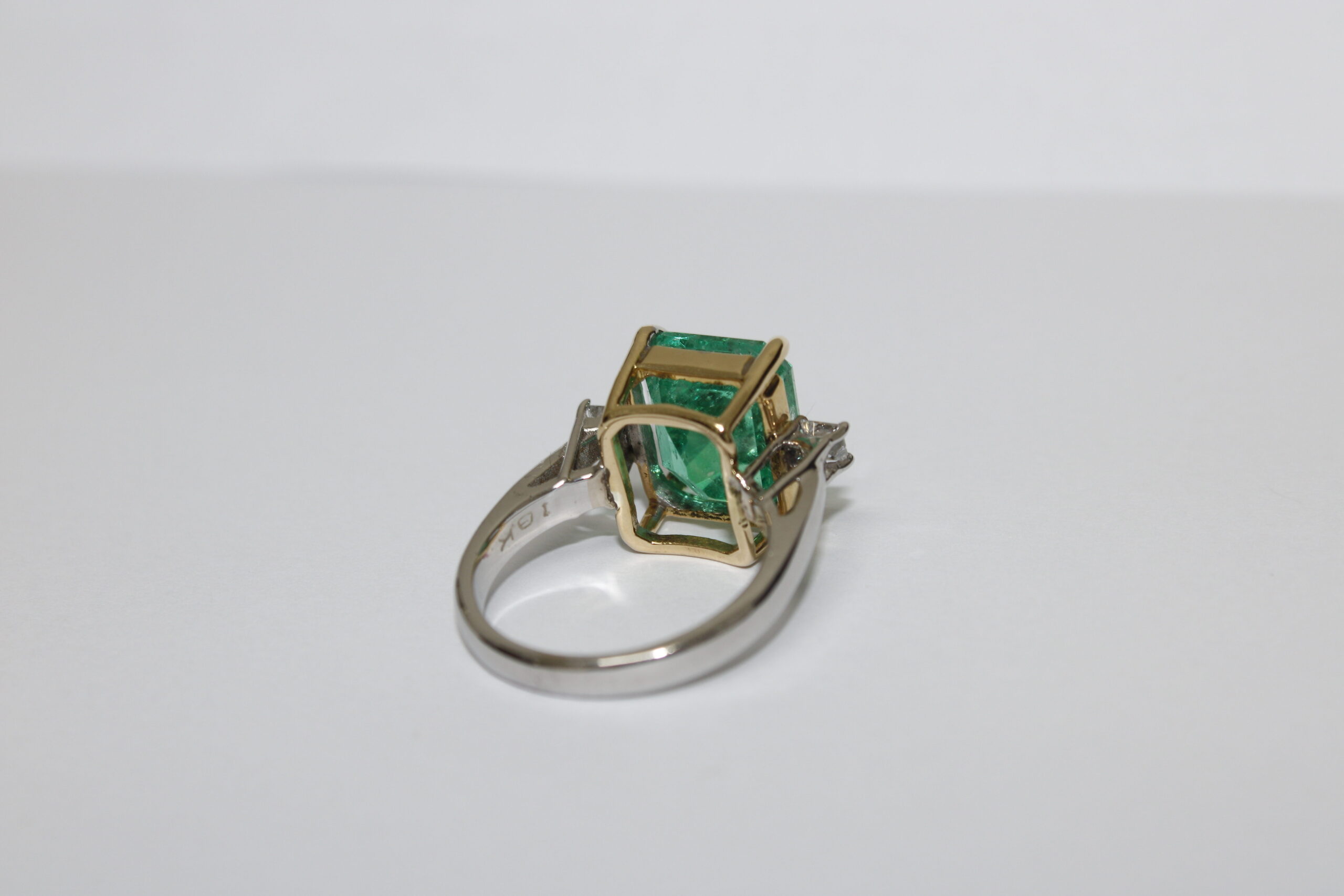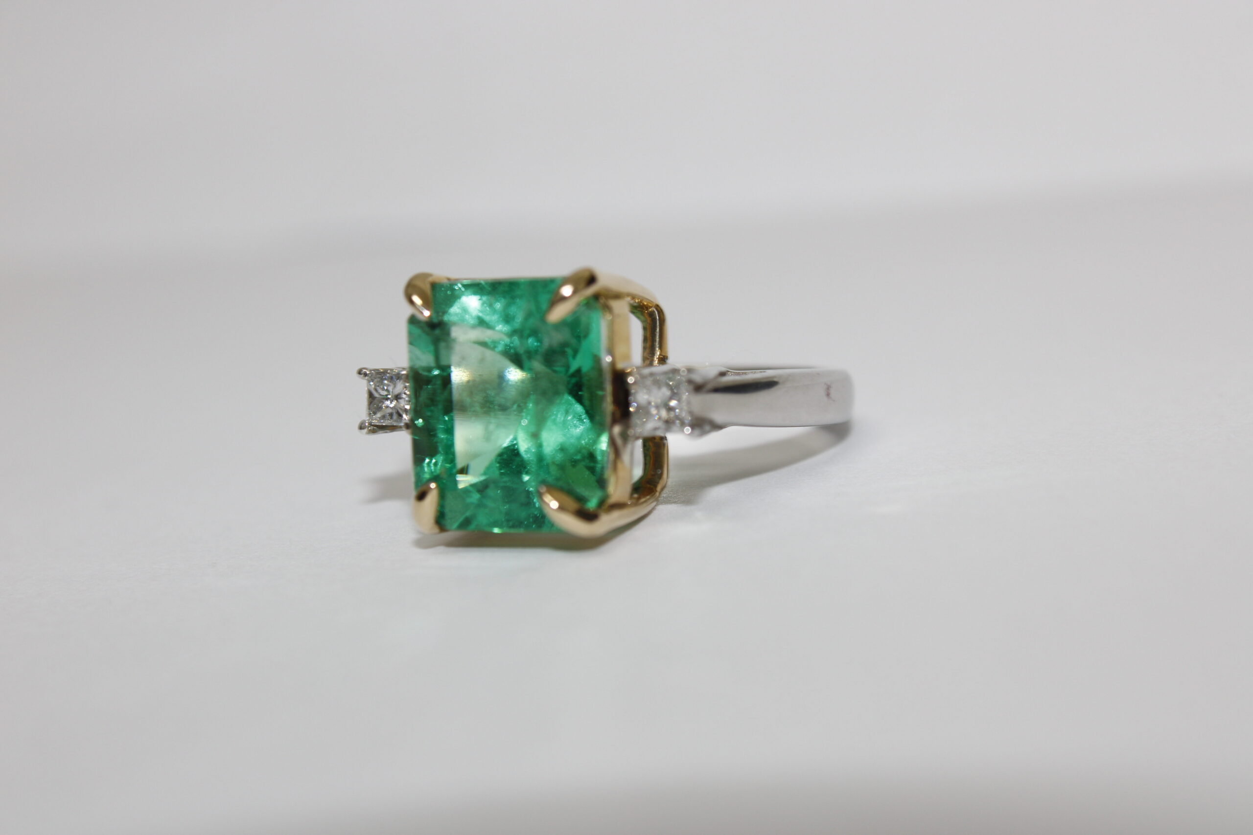 “This exclusive ring combines elegance and sophistication in a timeless design. Crafted in 18K white gold, with the crown holding the gemstones made of 18K yellow gold, the contrast enhances the beauty of the piece. The central feature is an impressive 6.79 ct natural emerald, of Colombian origin, treated with F1 oil to enhance its vibrant color and exceptional clarity, reflecting the richness of its origin.