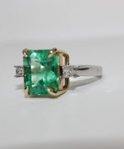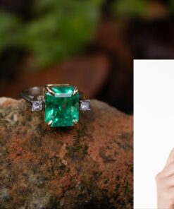 Flanking the emerald are two 0.12 ct diamonds, offering a dazzling sparkle. The diamonds, with H color and VS1 clarity, add a refined touch to the design, accentuating the beauty of the piece.”